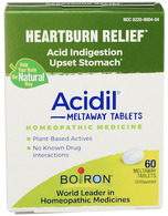 Acidil temporarily relieves occasional heartburn, acid indigestion, bloating or upset stomach.* Its four natural active ingredients are the most commonly used homeopathic medicines that address these symptoms. Acidil does not cause drowsiness, constipation or gas. It has no known interactions with other medications, and it is not contraindicated with pre-existing conditions. Acidil does not contain aluminum hydroxide, which may cause constipation, or magnesium hydroxide, which may cause diarrhea. Recommended for everyone ages 12 and up, and is available in a box of 60 quick-dissolving tablets.