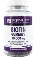 Rejuvicare® Biotin Gummies provides 10,000 mcg of biotin per serving in a delicious Raspberry flavor. Biotin, an essential B vitamin has been shown to promote normal hair growth and protect against dryness. Biotin also helps to metabolize and enhance the proper use of nutrients. It has been shown to contribute to the breakdown of foods and binds to certain enzymes that play additional health roles. It is important to supplement with biotin to support healthy hair, skin and nails.†