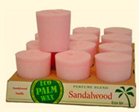 Eco Palm Wax™ with organic Palm Wax from Brazil and Colombia. Perfume Blends with Essential Oils. Two ounces each. Burn time is 16 hrs. Always burn votives in a votive glass. Cotton wick for clean and steady burn. Post-Consumer Cardboard box.