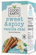 Ingredients: black tea, natural flavor, cinnamon, natural vanilla flavor with other natural flavors, cardamom, ginger root, natural peach flavor with other natural flavors, nutmeg, cloves, chicory root, licorice root, Chinese star anise, black pepper, steviol glycosides (stevia).