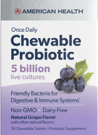 A healthy digestive system is important especially when you consider 70% of the cells in the immune system call it home. American Health Chewable Probiotic is an easy and delicious way to get friendly bacteria for your digestive and immune systems.* Each chewable contains a mix of two probiotic strains and is guaranteed to deliver 5 billion live cultures. American Health Chewable Probiotic gives you all that… and you only have to take it once a day!