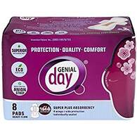 Concerned about your health and safety, but still want to be comfortable, fresh and hygienic? Genial Day Eco-certified pads were designed with YOU in mind - to help alleviate the common problems associated with PMS and vaginal infections. They are the most healthy, safe, absorbent, comfortable and Eco-friendly pads out there! The new anion strip technology with silver and tourmaline allows for fragrance-free odor control which also eliminates toxic chemicals. The Genial Day functional Eco-certified pads are also clinically tested for bio-compatibility so they won't cause irritation. Join the period revolution of 1 million women - and detox your period today with Genial Day! >pH friendly to skin, toxin-free, fragrance-free, non-chlorine bleached >super absorbent air-laid cotton holds up to 164 g, about 5 times more than other organic pads >leakage control channels, 3D side walls, wide back, and 4-winged construction provide stability and security >yellow anion strip with silver and tourmaline protects against skin irritation and odor >"stay dry" cover sheet funnels away fluid so that you'll never feel wet >breathable back layer eliminates heat and humidity