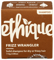 Description: For those of you with beautiful curly hair, or who abuse your hair with hot irons, curlers, hair dryers or bleach, Frizz Wrangler is for you. Supremely smoothing without weighing your hair down, making your hair silky smooth and easy to style. Features: Certified Vegan and Cruelty Free. Certified Palm oil-free. 100% plastic-free. pH balanced and safe for colour treated hair. Equivalent to 3x 350ml bottles of liquid shampoo. Directions: Thoroughly wet your hair. Swipe the bar several times through your roots. Put the bar down. Work the product through your hair, it will lather up! Rinse and follow with conditioner if you need to. Ingredients: Sodium cocoyl isethionate, sodium coco-sulfate, Cocos nucifera (Coconut) fruit, stearic acid, aqua (Water), decyl glucoside, Theobroma cacao (Cocoa) seed butter, stearyl alcohol, cetyl alcohol, lactic acid, caprylic/capric triglyceride, sodium isethionate, behentrimonium methosulfate, fragrance^. ^Certified natural fragrance. Ethique is 100% palm free. All ingredients are derived from non-palm sources such as rice bran or coconut oils. Ingredients: Sodium Cocoyl Isethionate, Sodium Coco-sulfate, Cocos Nucifera (Coconut) Fruit, Stearic Acid, Aqua (Water), Decyl Glucoside, Theobroma Cacao (Cocoa) Seed Butter, Stearyl Alcohol, Cetyl Alcohol, Lactic Acid, Caprylic/Capric Triglyceride, Sodium Isethionate, Behentrimonium Methosulfate, Fragrance.