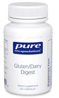 Gluten/Dairy Digest contains a blend of digestive enzymes targeting gluten and dairy digestion. It provides a blend of proteases specially formulated with dipeptidyl peptidase IV (DPP-IV) activity to help break down gluten peptide fragments in normal digestive systems. Studies suggest that it may also promote a healthy cytokine balance to support GI comfort and function. Additionally, this formula provides a unique mixture of protease enzymes and lactase to assist digestion of multiple constituents of milk and dairy products. Protease enzymes targeting casein and beta-lactoglobulin proteins support dairy protein digestion. Casein is the predominant protein in milk and cheese. Beta-lactoglobulin occurs primarily in the whey fraction of milk. It is an acid-stable protein and therefore may not be broken down by pepsin and pancreatin. Lactase breaks down the milk sugar lactose, helping to relieve occasional bloating or gas that some people can experience from dairy consumption.