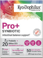 Kyo-Dophilus® Pro+ Synbiotic comes in tasty chewable tablets that contain a specially selected prebiotic and a community of nine probiotic strains including The Friendly Trio®. Synbiotic is a term used for probiotics and prebiotics which are combined to provide a synergistic beneficial effect in the microbiome. The BioEcolians® prebiotic in Pro+ contributes to the population of Lactobacilli and Bifidobacteria species by feeding the good bacteria to help maintain bacterial balance.*