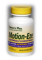 Motion-Eze is a multi-faceted nutritional supplement designed as an all natural motion-mate formula. Each scientifically engineered tablet utilizes an innovative bi-layered technology for rapid and sustainable results. The rapid release layer supplies the powerful effects of standardized ginger root, while the sustained release layer supplies a soothing profile of natural botanical extracts including kava, chamomile and passion flower. Motion-Eze -- The perfect, natural solution for long trips! Ingredients Ginger (Zingiber officinale root) (standardized 4% [14 mg] volatile oils) 350 mg Kava (Piper methysticum) (standardized 29-31% [14.5-15.5] kavalactones) 50 mg Chamomile (Matricaria recutita flower) (standardized 1% [0.5 mg] apigenin, 0.5% [0.25 mg] essential oil) 50 mg Hops (humulus lupulus fruit) (standardized 5.2% [2.6 mg] bitter acids, 4% [2 mg] flavonoids) 50 mg Siberian Ginseng (Eleutherococcus senticosus root) (standardized 0.8% [0.4 mg] eleutherosides) 50 mg Passionflower (Passiflora incarnata) (standardized 3.5-4% [1.75-2 mg] flavonoids, calculated as isovitexin) 50 mg Wild Cherry (Prunus virginiana fruit) 50 mg