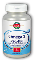 KAL® Omega 3 720/480 Fish Oil comes from fish caught in cold water. Two softgels provide high levels of EPA and DHA which have been studied for their ability to provide nutritive support for many health benefits. KAL® fish oils go through a purity process, including molecular distillation, to remove heavy metals, PCBs, dioxins, furans and other contaminants to meet superior fish oil standards.