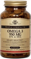 Omega 3 950 is Solgar’s highest concentration of the natural Omega 3 polyunsaturates EPA and DHA from cold-water fish. This formulation supports cardiovascular, joint, and skin health. It is molecularly distilled to remove mercury.