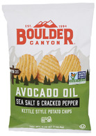 Boulder Canyon Kettle Cooked Potato Chips, Avocado Oil, Cracked Pepper & Sea Salt are made with premium American grown potatoes which are then kettle cooked in small batches and seasoned to perfection. These thickly sliced and deliciously crunchy chips are vegan, kosher, gluten-free, and non-GMO, and they also do not contain trans fat, MSG, or cholesterol. Each chip has been cooked in pure avocado oil for a uniquely subtle, buttery flavor. Each bag of Boulder Canyon Kettle Cooked Potato Chips, Avocado Oil, Cracked Pepper & Sea Salt contains 5.25 oz. of product.