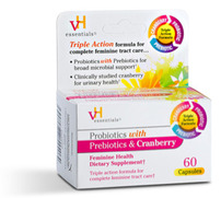 Help maintain feminine health and balance with vH essentials® Probiotics with Prebiotics & Cranberry Feminine Health Dietary Supplement. Our triple-action formula offers you complete feminine tract care. It’s a natural way to bolster both feminine tract and urinary tract health. Here’s how it works. The probiotic supplements your existing bacteria. The Prebiotic helps nourish existing good bacteria. And the clinically studied