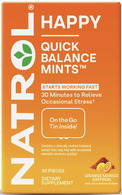 Quick Balance Mints are easy and convenient for life on the go. These Natrol dietary supplements are clinically shown to support a healthy stress response and relieve occasional stress.(1) This Quick Balance Mint starts working in 30 minutes to relieve occasional stress, and after four weeks of daily use, to help support a positive outlook and improved irritability.(1) The non-GMO, sugar-free Quick Balance Mints have a delicious Orange Mango Saffron flavor.