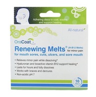 Renewing Melts (H-B12 Melts) are long-lasting adhering discs with hyaluronan and bioactive B12 for temporary relief of minor surface pain in the mouth. Renewing Melts adhere to a tooth, gums, or brace nearest the sore, last for hours, and fully dissolve.