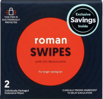 Roman Swipes are a product designed to help men last longer during sexual activity by desensitizing the penis. They are individually packaged wipes that contain benzocaine, a local anesthetic.