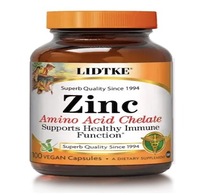Amino Acid Chelate LIDTKE zinc is chelated to produce small, organic molecules that pass easily through the digestive tract and are gentler on the digestive system. As Bisglycinate chelate is, an advanced, more bioavailable form of this essential mineral. No added gluten, yeast, wheat, corn, soy, rice, milk, dairy, eggs, tree nuts, peanuts, fish, shellfish, salt, sugar, animal derivative, artificial color or flavor. Non-GMO DIRECTIONS: (Adults): Take one (1) capsule with food or beverage or as directed by a health-care professional.